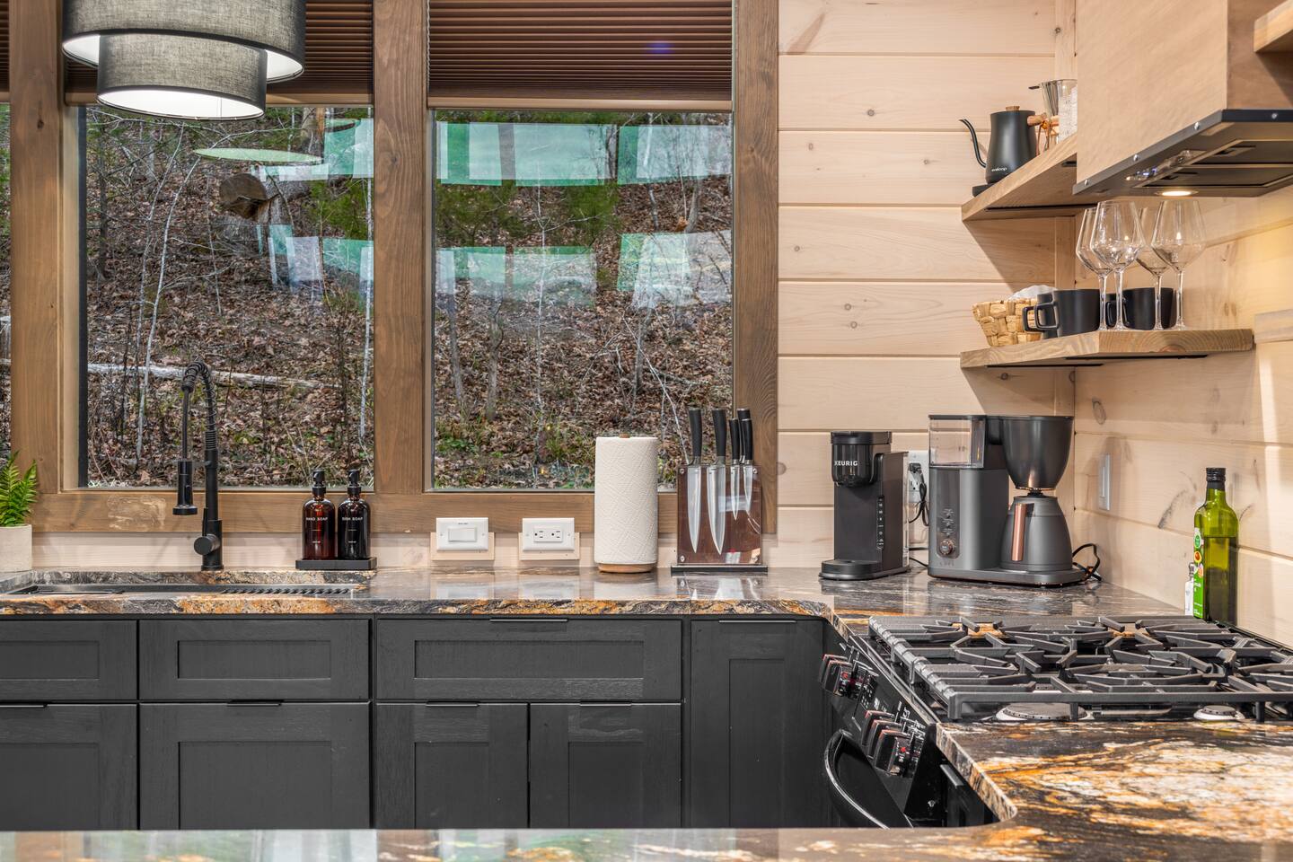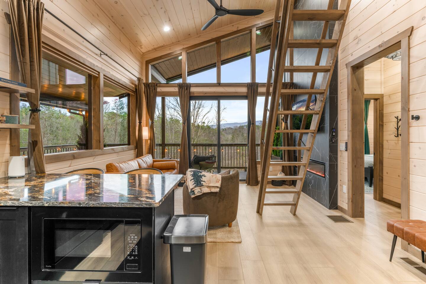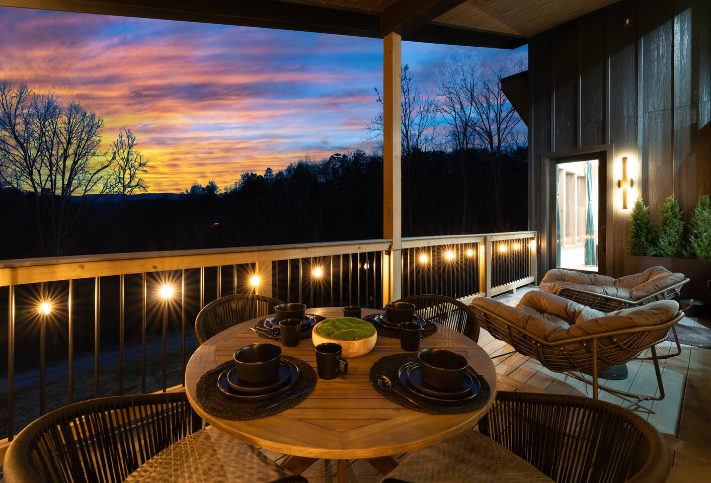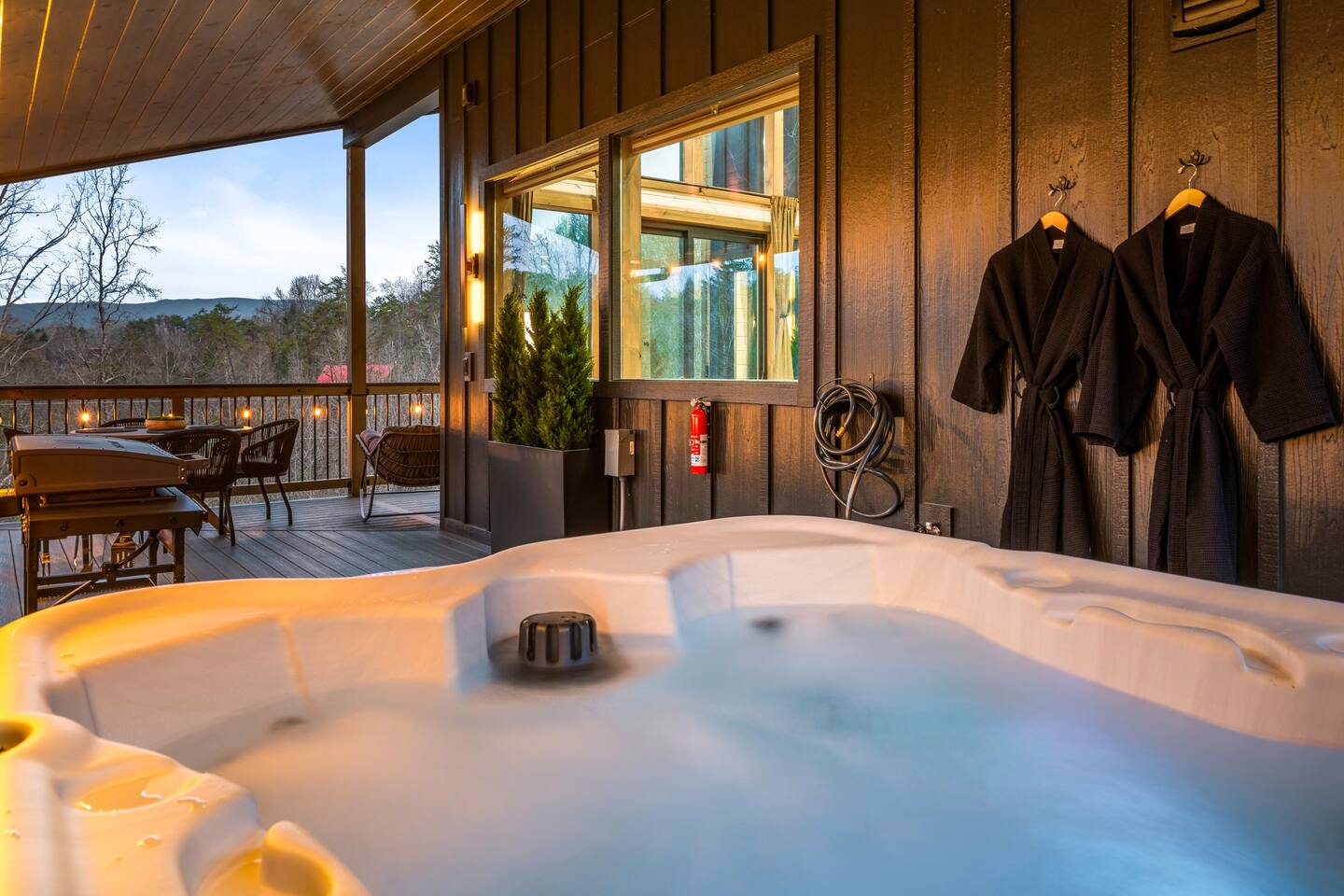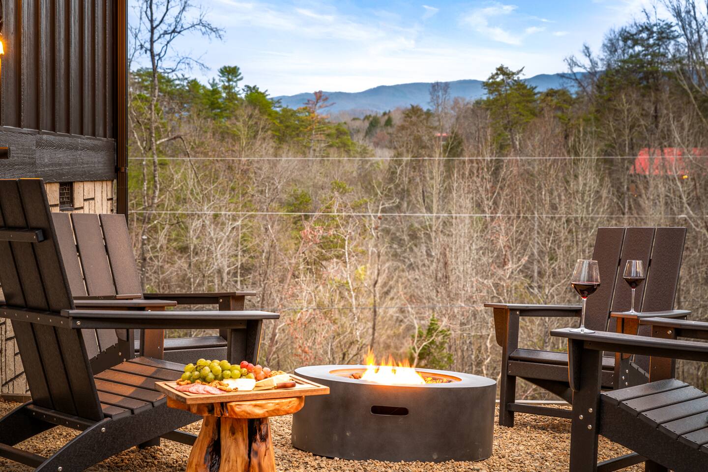 ♨️4-Person Hot Tub 🔥Outdoor Firepit 🛏️Comfy King Bed 📺 Smart TV's 🍴Gourmet Kitchen 🧼Washer/Dryer 🏔️Mountain Views 💕Romantic Feel ☕ 🍳Coffee Bar 📶Wi-Fi 🚗Private Parking 🛁Spa Like Bath/Shower 🔥Blackstone Grill 🌙Private Balcony