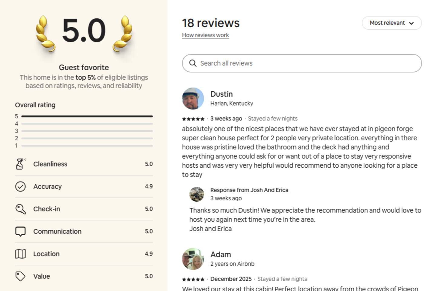 Designed for couples, this romantic Smoky Mountain cabin blends modern comfort with cozy mountain charm. Perfect for honeymoons, anniversaries, or a peaceful escape. 10 minutes to Pigeon Forge and 20 minutes Gatlinburg—created for relaxation and connection. The cabin can also accommodate up to 4 guests , including those traveling with 1-2 children(we have a plush leather pull out sofa). Reaching the cabin is easy- and the peaceful drive into the cabin is part of the charm. 4 wheel drive NOT needed. The Great Smoky Mountains National Park, Pigeon Forge, and plenty of hiking trails are all nearby and will leave you in awe with their rich natural treasures. ✔ Newly built in 2025 ✔ Electric vehicle charger ✔ Propane fire pit ✔ Private patio with mountain views ✔ Hot tub and robes ✔ Outdoor Blackstone grill ✔ Outdoor dining table and chairs ✔ Rocking chairs ✔ King bed & one pull out sofa bed ✔ Two large smart TV's ✔ Wi-Fi ✔ Washer Dryer ✔ Electric fireplace ✔ Location: ✔ Gourmet Kitchen ✔ Privacy ✔ Upstairs loft for reading and relaxation See more below! ★ LIVING ROOM ★ Make yourself a hot cup of coffee and cozy up next to the electric fireplace in the living room. Watch a movie with your loved one or retreat to an imaginary world by reading a book. The living room offers all comforts needed to unwind and feel at home. ✔ Comfortable Leather Sofa with Pillows ✔ Pull out Sofa for Children or Extra Guests ✔ Smart TV with Netflix, Hulu, Etc. ✔ Indoor Fireplace ✔ Puzzle ✔ Reading Lamp ✔ Access to the Private Patio ★ KITCHEN & DINING ★ The kitchen is a cozy space where you can share a drink and enjoy intimate conversations while your meal comes together. The cabin offers a sleek four burner gas stove, oven, microwave and toaster. The charming setup allows your designated chef to create a delicious meal, adding to the warmth of your time together. ✔ Microwave ✔ 4 Burner Gas Stove ✔ Dishwasher ✔ Gas oven ✔ Toaster ✔ Coffee Bar (12 Single Cups and Classic Pot Coffee Brewing) ✔ Refrigerator/Freezer ✔ Sink - Hot & Cold Water ✔ Refrigerator and Freezer with Ice Maker and Filtered Water ✔ Glasses ✔ Silverware ✔ Pots & Pans ✔ Cookie Sheets Once everything is done and ready, serve it at the lovely bar table opposite the kitchen. We provide 12 Keurig singles and a starter brewed coffee kit for your stay. As mentioned before, you can also choose to eat on the back deck and marvel at the views and serene sounds of nature no restaurant can match. ★UPSTAIRS LOFT★ The upstairs loft is a quiet space to read and enjoy a book, or simply have some much needed rest. ✔ Jenga ✔ Deck of Cards ✔ Assortment of Books ✔ Bean bags ★ SLEEPING ARRANGEMENTS ★ ♛ King-Size Bed ♛ Night Stands with Reading Sconces ♛ Premium Pillows, Linens, and Sheets ♛ Queen Size Pull Out Sofa Bed The king size bed (Nectar Luxe Hybrid Mattress) and premium linens and sheets will make you feel as if you are sleeping on clouds. ★ BATHROOM★ The cabin features a full bathroom. It is equipped with essential toiletries, so you don't need to overpack. Keep in mind, there is only a starter set of toiletries (shampoo, conditioner, shower gel, hand soap, makeup wipe). ✔ Walk-In Shower With Dual Shower Heads ✔ Mirror ✔ Toilet ✔ Towels ✔ Hair Dryer ✔ Essential Toiletries ✔ Stand Alone Bath Tub ★ OUTDOOR AREAS ★ Peace and quiet will envelop you during your stay. In the mornings, quietly sip your coffee on the front back deck. Unwind in the luxurious hot tub after a day of hiking or exploring the surrounding area . Enjoy plush egg chairs on your private balcony or enjoy the quiet romantic fire pit with mood lighting. Enjoy grilling on the backstone grill and serve it up to your loved ones on the private balcony. ✔ Back Deck (Luxury Hot Tub, Romantic Lighting, Plush Egg Chairs, Blackstone Grill, Dedicated Dining Table and Chairs) ✔ Fire Pit and Adirondack Chairs ✔ Guest access: Smart Lock with Unique Door Code ✔ Hot Tub The cabin is exclusively yours, without interruption during your stay, so relax, unwind, and make yourself at home. Other than the already mentioned amenities, our home is also equipped with: ✔ Reliable Wi-Fi ✔ Air Conditioning ✔ Heating ✔ Free Parking ✔ EV Car Charger(Please bring your own adapter) Other things to note: 1. This rustic cabin is located in the woods, immersed in nature, and you will likely see and hear woodland critters. This includes bugs! We do have pest control, however. 2. Bears are infrequent visitors of the cabin but please be aware! While they are truly an unforgettable sight to see, you will need to be sure you keep your car free of food and doors locked AT ALL TIMES. Do not approach or feed the bears. 3. This community is very quiet and has lots of character. Please enjoy it! ★ ARRIVAL INSTRUCTIONS ★ Simply input your personalized code to the smart lock and enjoy the cabin. ★ NO PETS ALLOWED★ We love those little (and not so little) pets. Sadly, our home is not suitable to accommodate them. If you sneak in a pet, you will be charged an additional $250 and asked to leave. ★ NO SMOKING INSIDE ★ Please refrain from smoking inside the home! Any smoking evidence will result in a $1000 fee for odor removal, and furniture cleaning. ★ NO PARTIES/EVENTS ★ We kindly ask you to treat our home as your own to preserve its pristine condition for future guests and your return visits. We encourage all of our guests to purchase trip insurance. Highly advised. It is the guest's responsibility to purchase trip insurance. By booking our cabin you accept our cancellation policy.